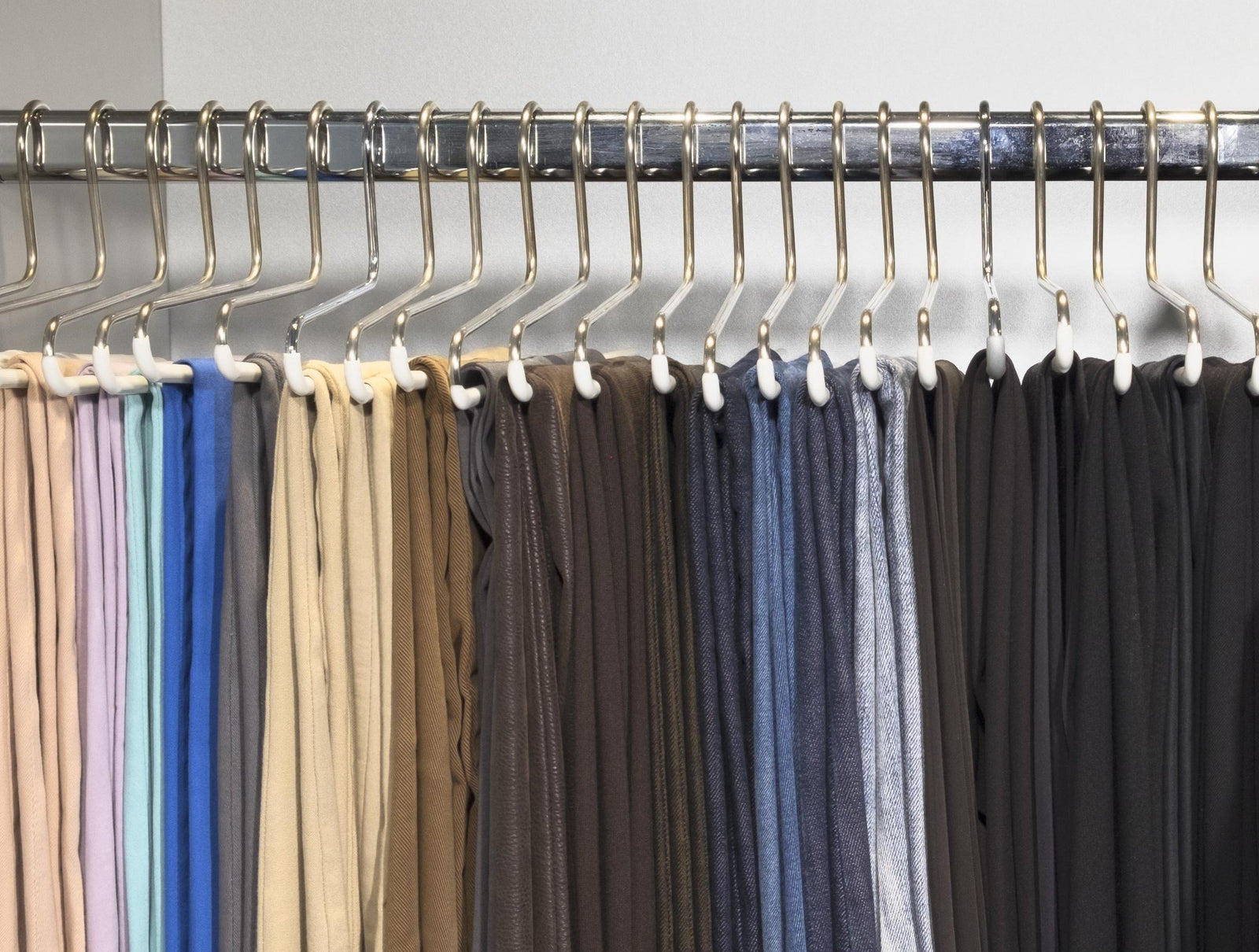 Sie haben einfach alles in einem ähnlichen Farbton? Dann empfehlen wir die Organisation nach Kleidungsarten. Hängen Sie Röcke, Hosen, Blusen, Shirts und Pullover jeweils in Gruppen und organisieren Sie so ihren Schrank nach der jeweiligen Klamottenart. MAWA bietet hierfür spezielle Bügel an, welche auf die perfekte Hängung ihrer Hosen, Blusen und Jacken abgestimmt sind und speziell für diese Kleidungsart gefertigt wurden. Dank der Antirutschbeschichtung bleibt so alles jederzeit am richtigen Fleck.
